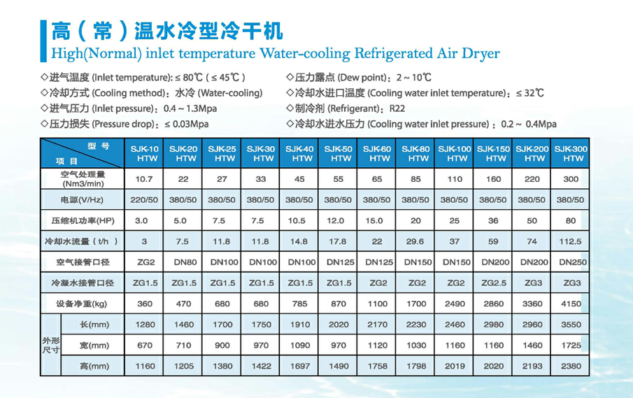 产品描述:冷冻式干燥机分为风冷型,水冷型,处理量从1m3/min到500m3/min,压力露点2-10℃,电源有220V/380V/440V等.空气系统有不锈钢,铝板换等
